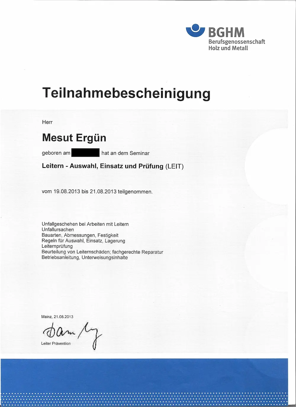 Teilnahmebescheinigung Leiterseminar – BGHM